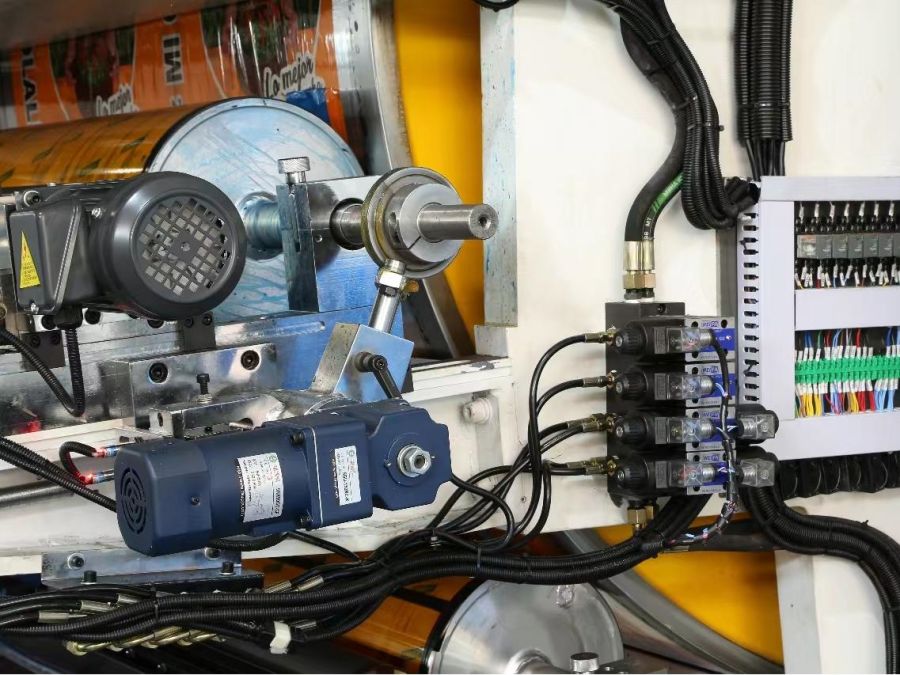 Our flexo printing machine adopt magnetic brakes or motors to control unwinder and rewinder tension. Magnetic brake can well control paper rolls and non woven fabric materials tension. If you need print flexible packaging film, we suggest motor control tension. Because motor output tension is more sensitive which is better for pressure sensitive material (such as opp, bopp, pvc film, lamination, self adhesive paper rolls).