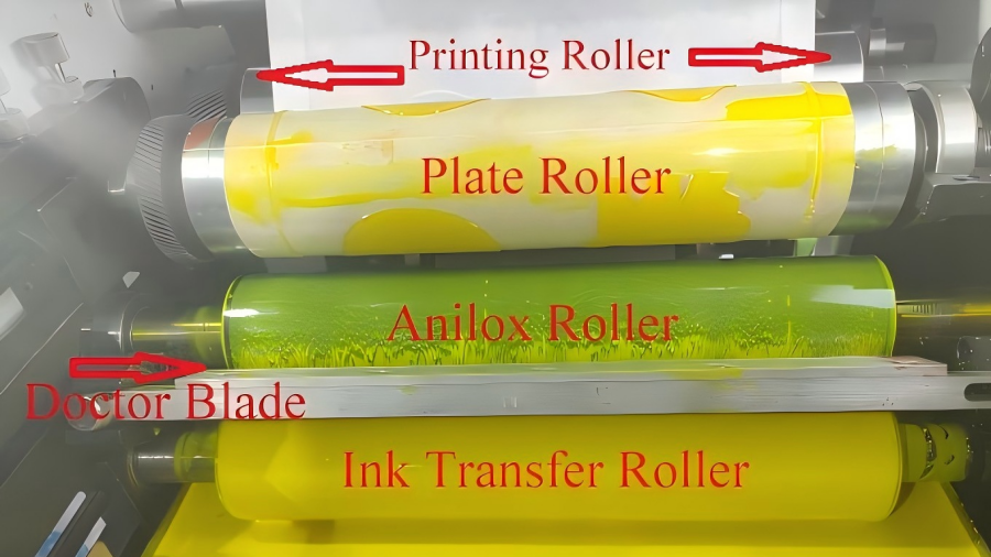 During flexo printing, ink is supplied to the surface of the anilox rollers by the ink tank or the doctor blade. Excess ink is scraped off by the doctor blade and remains only in the anilox cells. The printing plate transfers the ink of the graphic onto the surface of the substrate material such as paper, plastic film, non-woven, self-adhesive paper, etc. under pressure, thus obtaining a clear graphic.